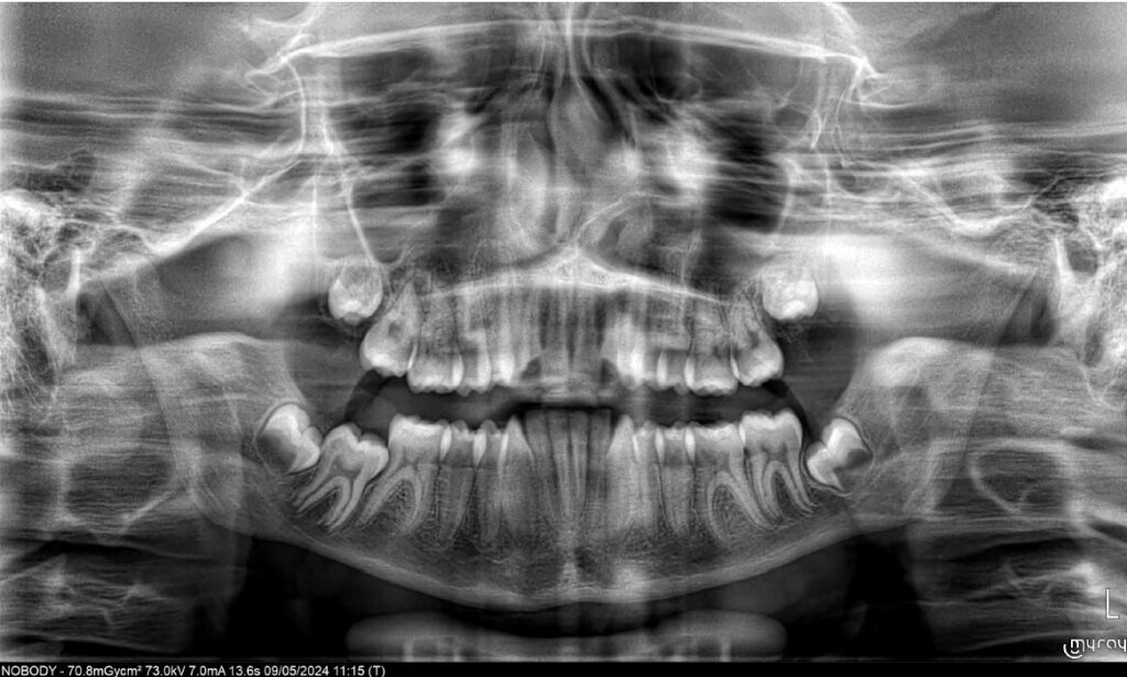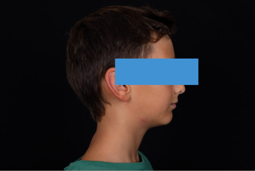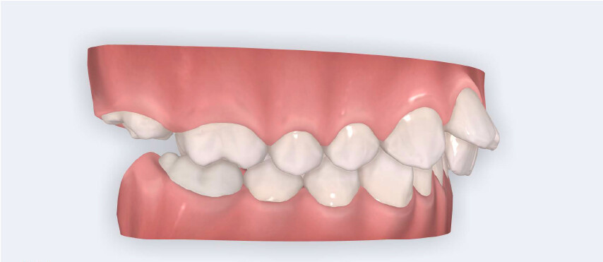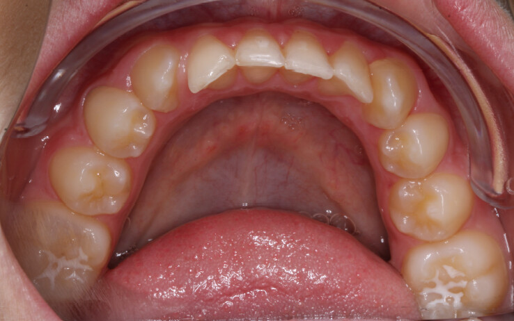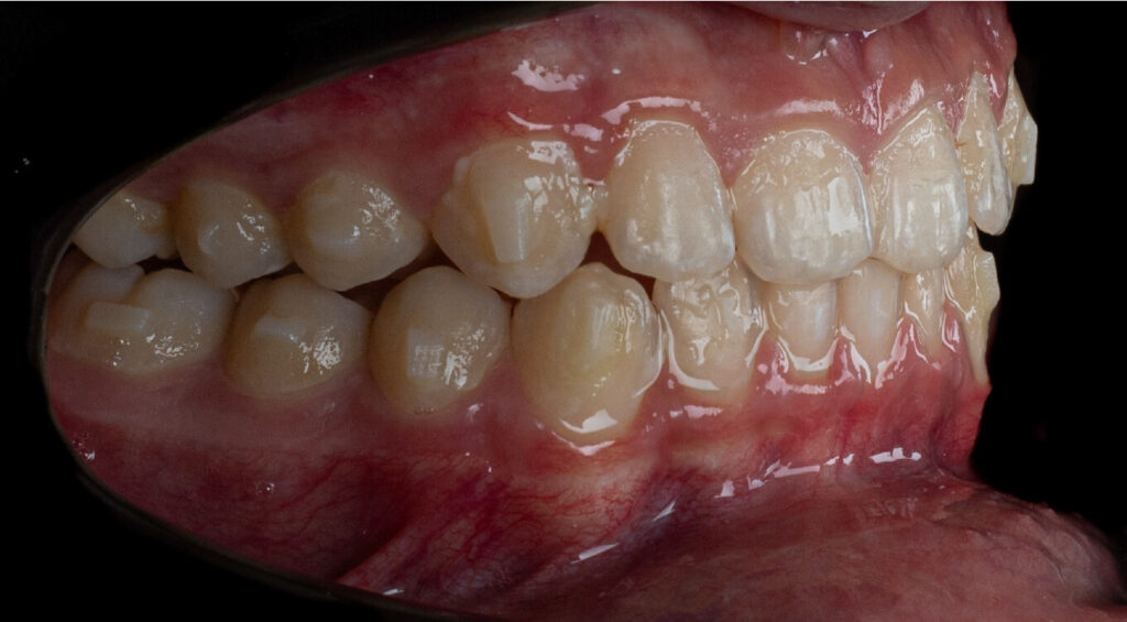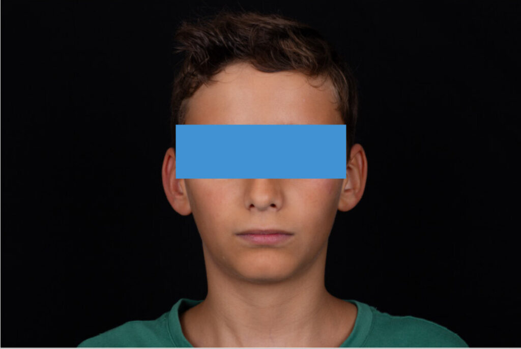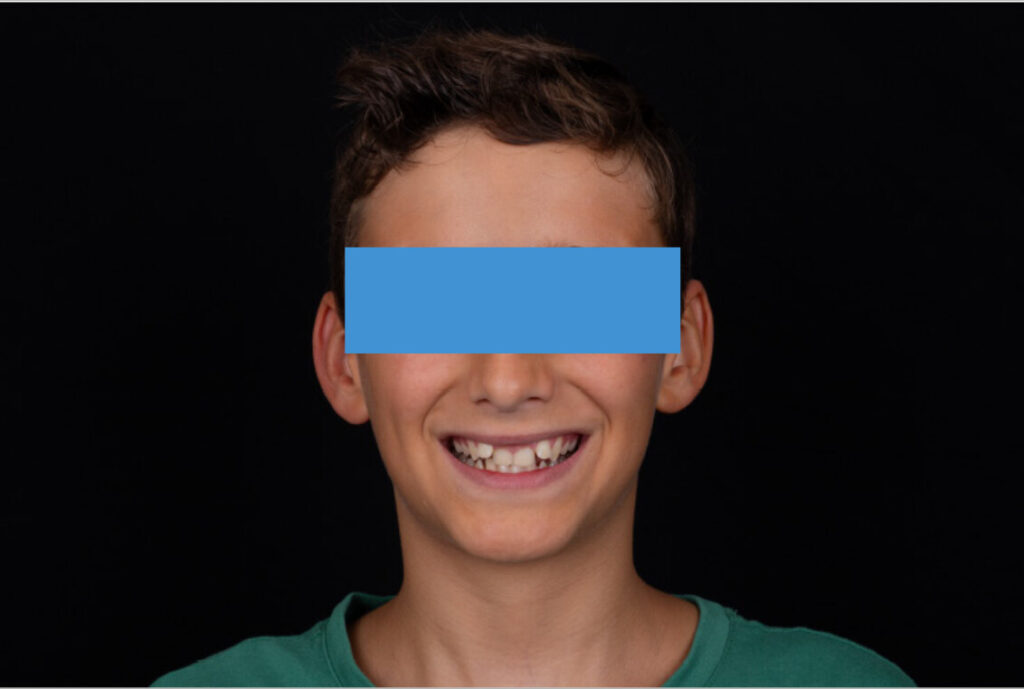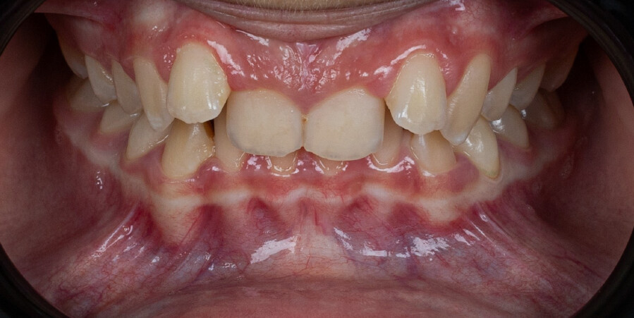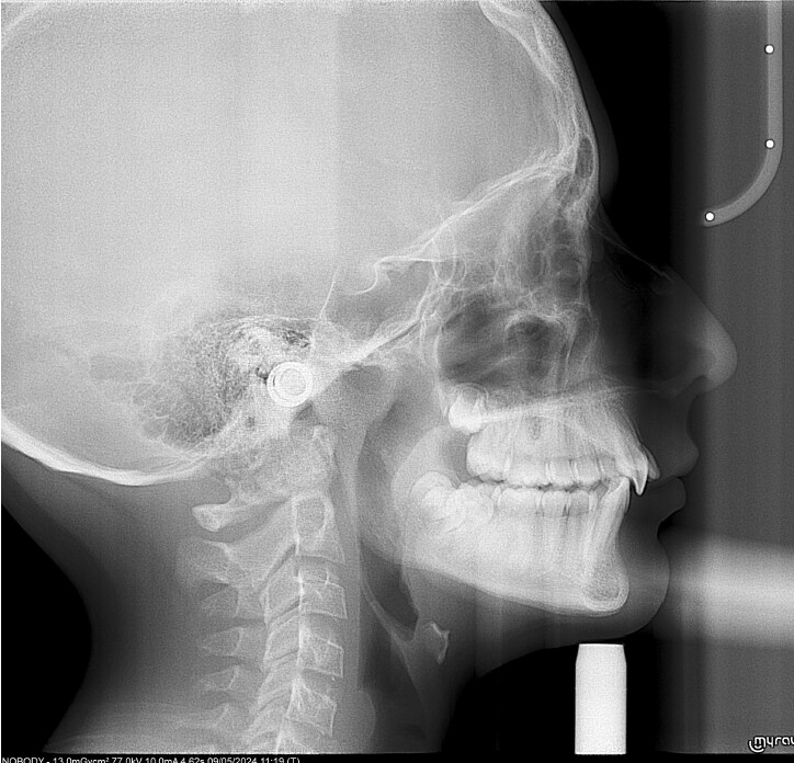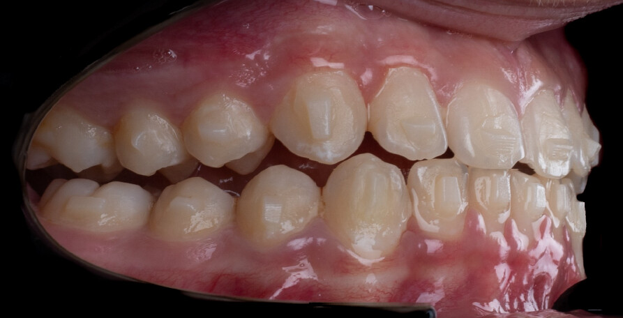 A 13-year-old male patient presented with a deep bite, characterized by near-complete coverage of the mandibular incisors. Clinical evaluation revealed bi-arch crowding, dental rotations, and proclination of the maxillary lateral incisors, contributing to the patient’s esthetic concerns. The facial profile was retrusive, consistent with mandibular retrognathism, and no significant periodontal abnormalities were detected.