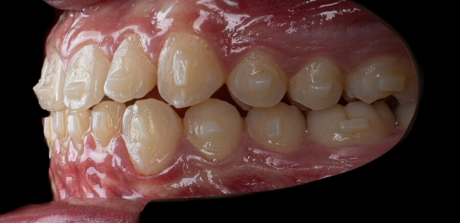 • Use of Class II elastics on Angel Buttons during the refinement phase to reinforce sagittal mechanics, introduced during the additional aligners stage.