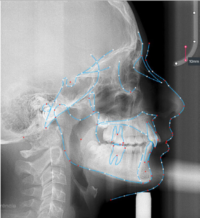 The patient presented with a skeletal Class II relationship with bilateral molar and canine Class II and a Class II division 2 dental pattern. The deep bite was associated with anteroinferior crowding and an accentuated Curve of Spee. Facial analysis revealed good symmetry, a slightly increased lower facial third, and a convex profile characterized by mandibular and chin retrusion. Lip competence was mildly reduced, with a decreased nasolabial angle and mentalis hyperactivity, all of which compromised overall facial harmony.