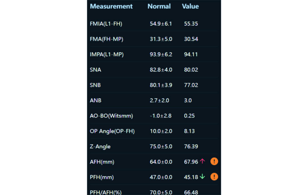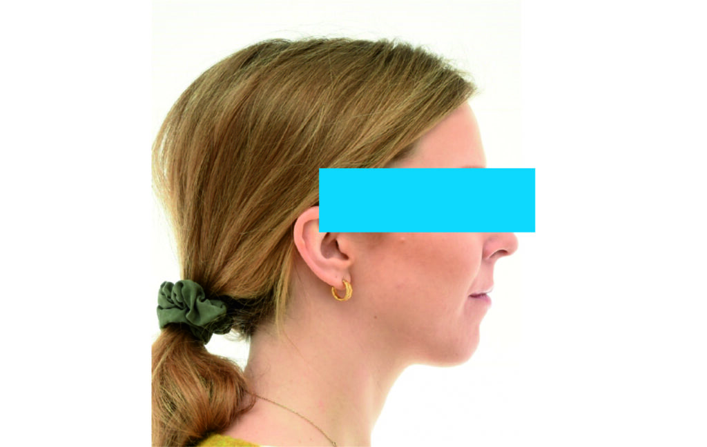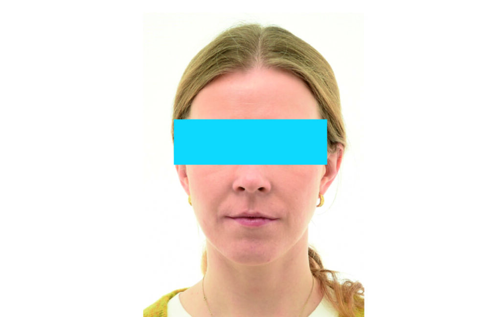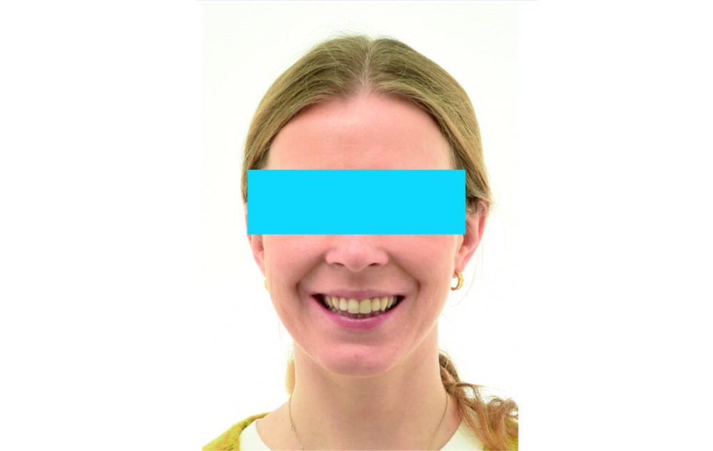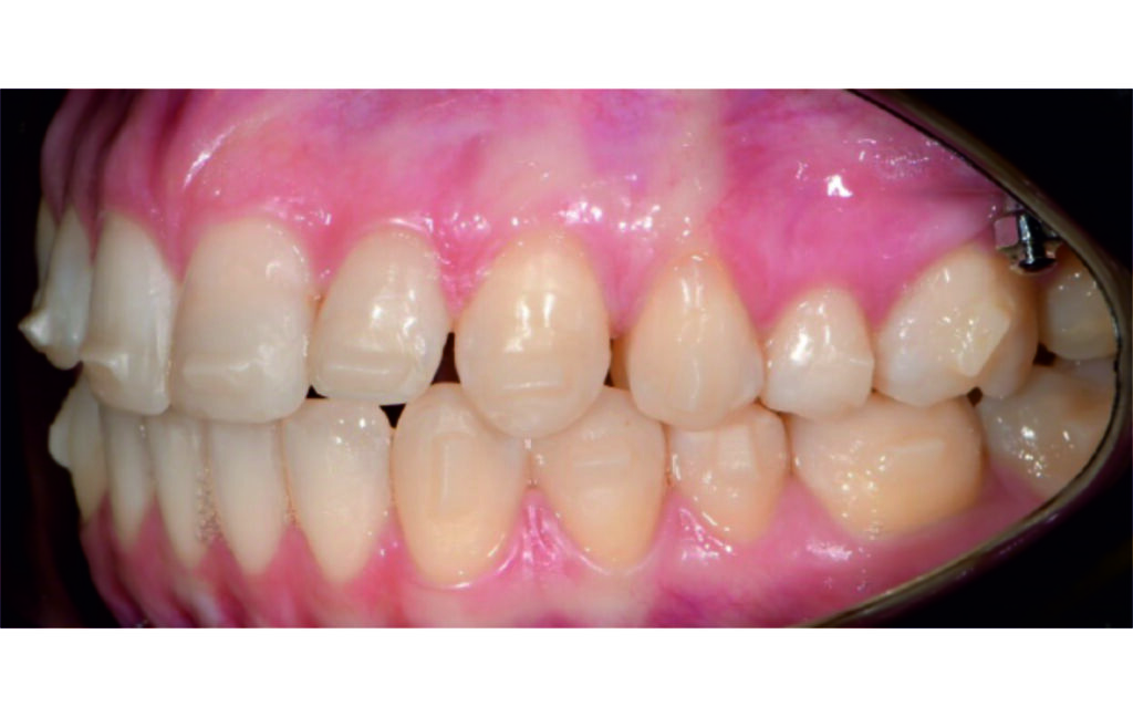 Angle Class II 2mm on the right, Angle Class II 2mm on the left, light mandibular asymmetry to the right, lower central line 1mm to the right, upper central line 1,5mm to the left, 1mm overjet and overbite. Sagittal asymmetry of upper dental arch. Light crowding upper and lower frontal segments, severe attrition of posterior teeth, night bruxism. Normal sagittal position of both jaws, high angle case, steep mandibular ramus,excessive lower facial height, open bite tendency.