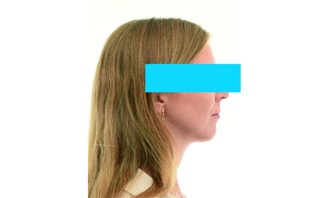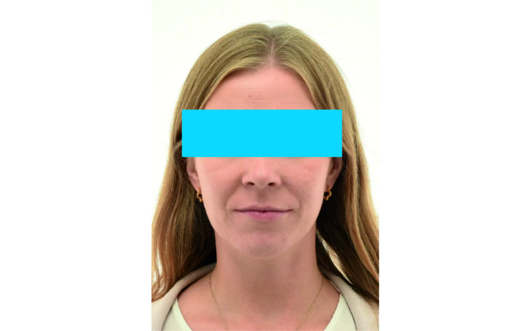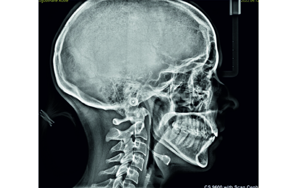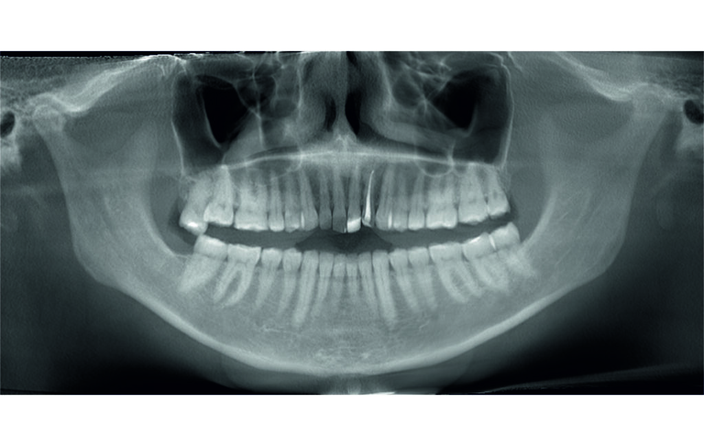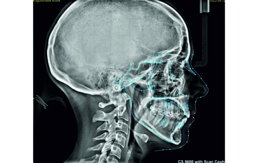 Angle Class II 2mm on the right, Angle Class II 2mm on the left, light mandibular asymmetry to the right, lower central line 1mm to the right, upper central line 1,5mm to the left, 1mm overjet and overbite. Sagittal asymmetry of upper dental arch. Light crowding upper and lower frontal segments, severe attrition of posterior teeth, night bruxism. Normal sagittal position of both jaws, high angle case, steep mandibular ramus,excessive lower facial height, open bite tendency.