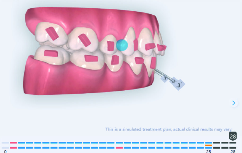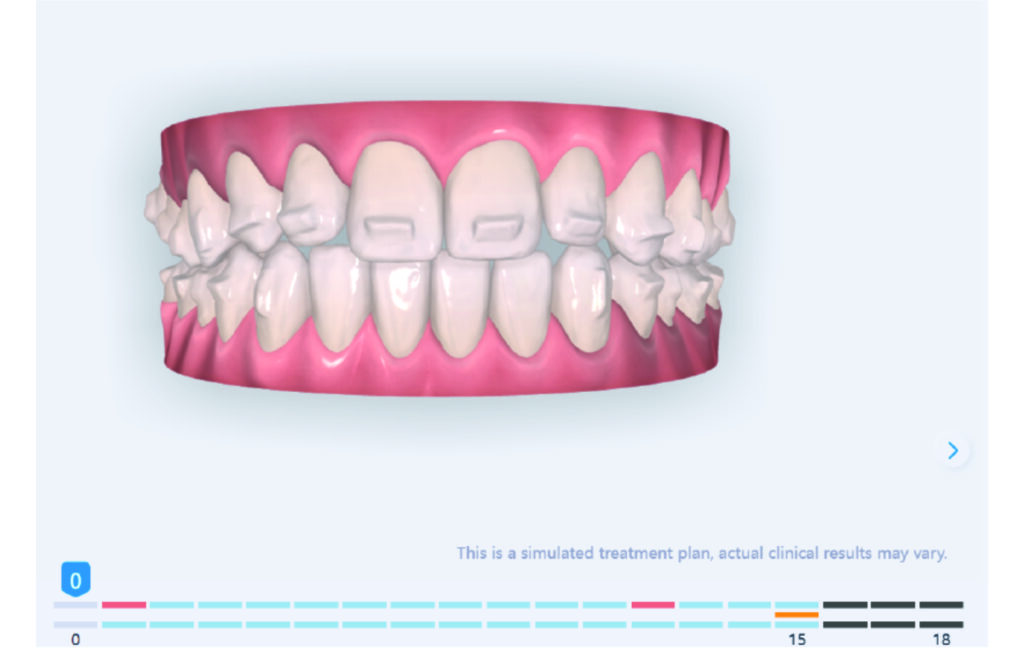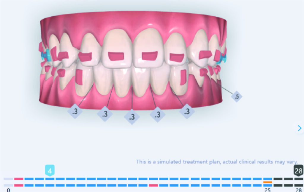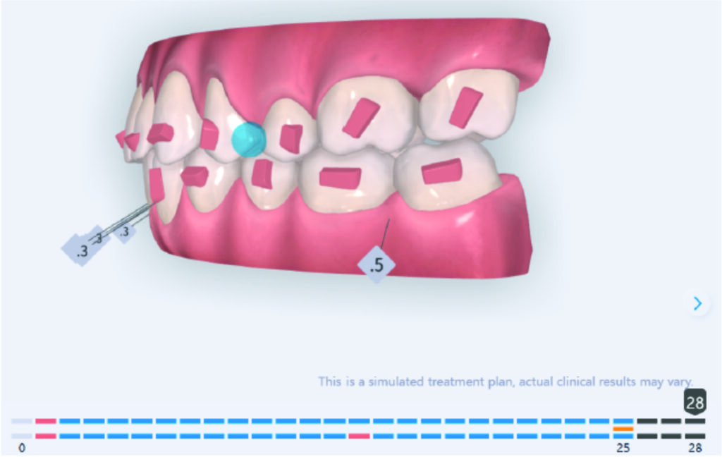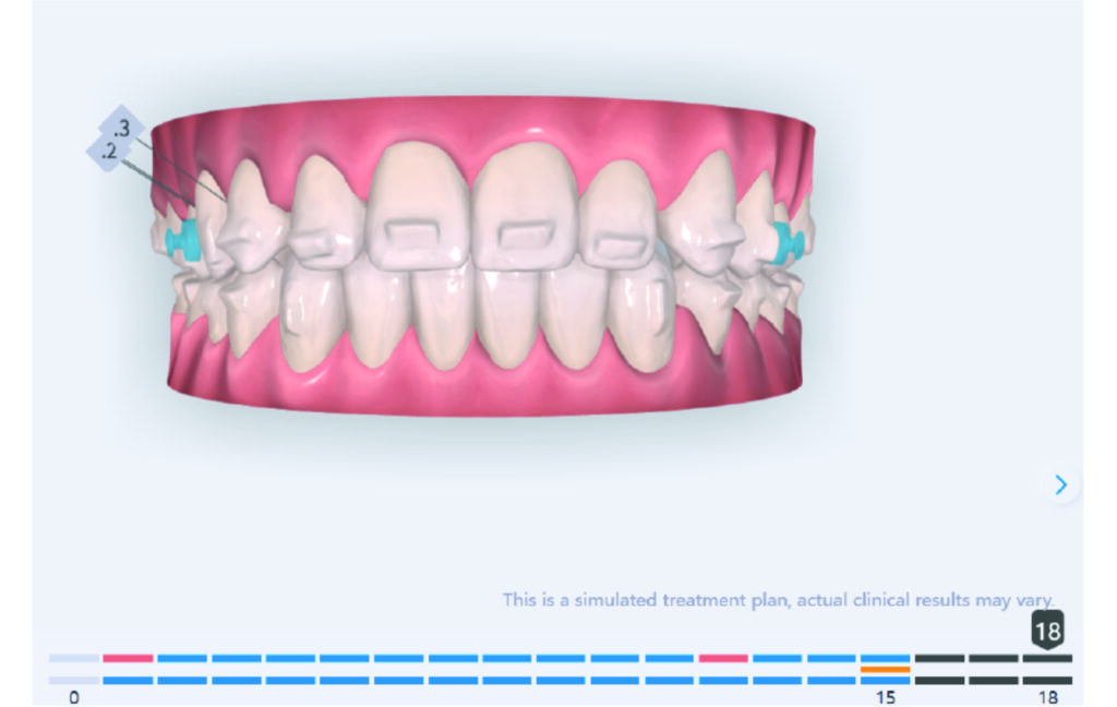A 1.5 mm deviation of the upper dental midline to the patient’s left was noted, along with a slight mandibular midline shift to the right, likely due to asymmetrical mandibular growth observed in the facial structure. Severe mesial rotations of teeth 16 and 26 were evident in the initial records. As derotation of 16, 26, 17, and 27 progressed up to aligner 16, the premolars in segments I and II moved distally, resulting in a bilateral Class I relationship, as intended in the initial treatment plan.