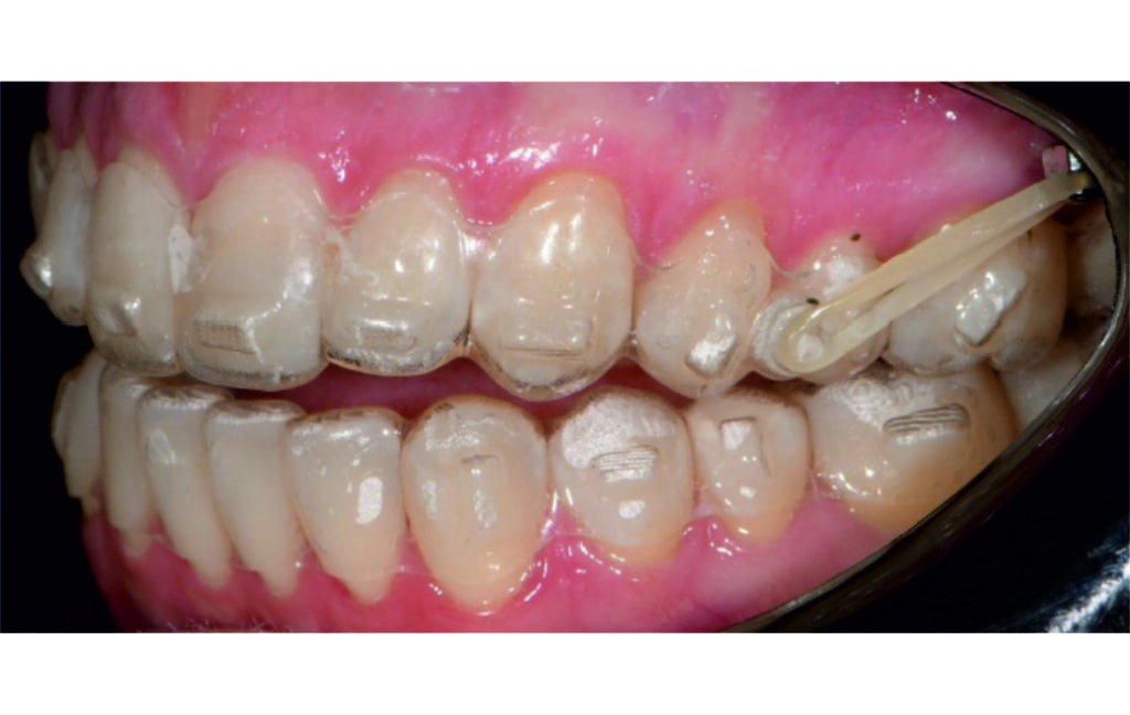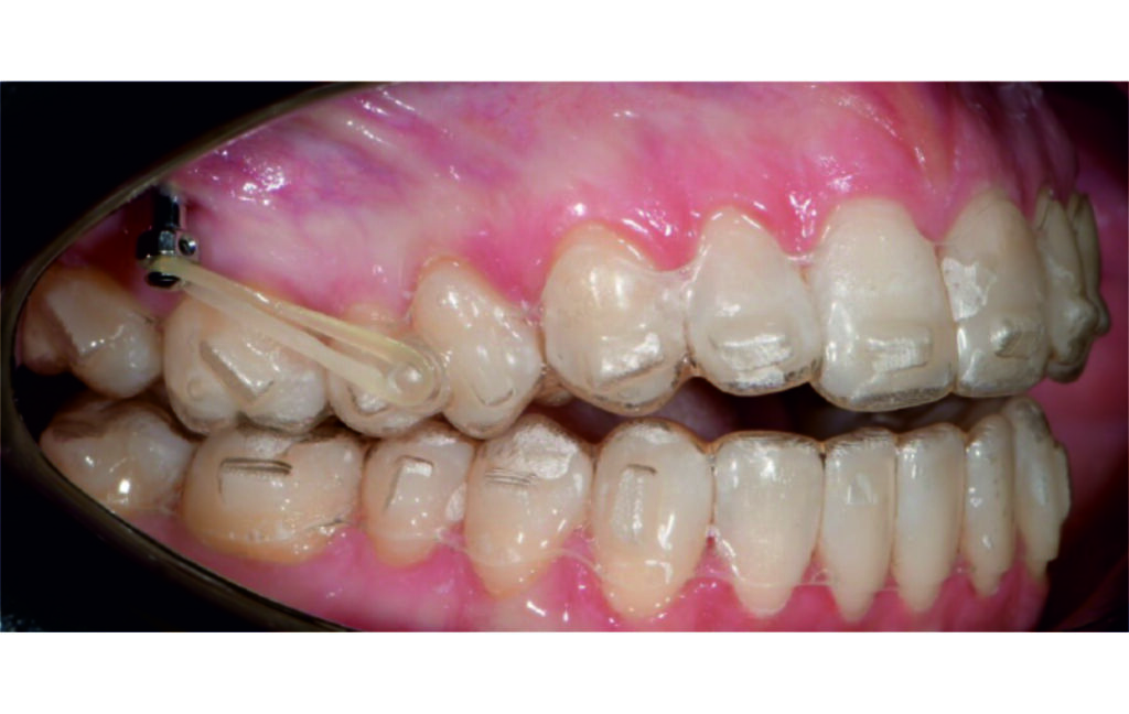 Vertical vector of elastic traction on buttons and IZC helped with the open bite correction.
